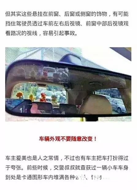 相信很多人經(jīng)常在車?yán)铩胚@個 當(dāng)?shù)亟痪硎拒囕v外觀技術(shù)參數(shù)是不能夠隨意改的,車主也因此被交警罰款1000元,被責(zé)令將車恢復(fù)原狀。小編提醒大家:車內(nèi)擺飾過多,擺放位置不當(dāng)確實易引發(fā)交通事故,特別是 ...