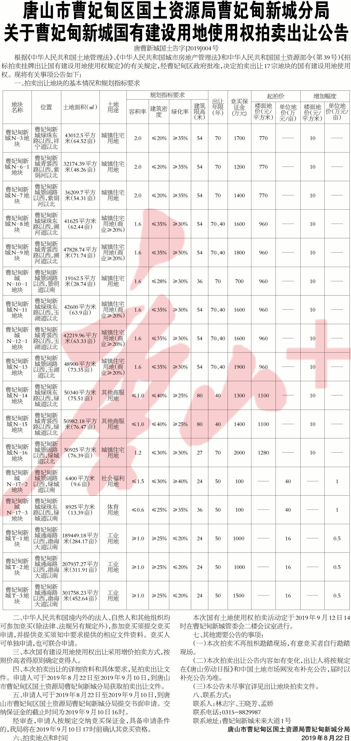 8月23日,《唐山勞動(dòng)日?qǐng)?bào)》刊發(fā)《唐山市曹妃甸區(qū)國(guó)土資源局曹妃甸新城分局關(guān)于曹妃甸新城國(guó)有建設(shè)用地使用權(quán)拍賣出讓公告》,涉及17宗地塊。開發(fā)用途為城鎮(zhèn)住宅、社會(huì)福利、商業(yè)用地、工業(yè)用地等。詳細(xì)內(nèi)容如下 ...