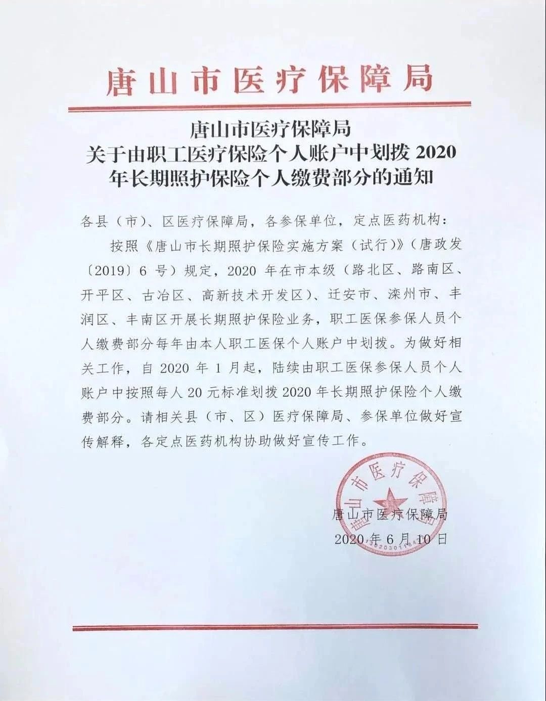 日前,唐山市醫(yī)療保障局發(fā)布《唐山市醫(yī)療保障局關(guān)于由職工醫(yī)療保險(xiǎn)個(gè)人賬戶中劃撥2020年長(zhǎng)期照護(hù)保險(xiǎn)個(gè)人繳費(fèi)部分的通知》。其內(nèi)容顯示,自2020年1月起,陸續(xù)由職工醫(yī)保參保人員個(gè)人賬戶 ...