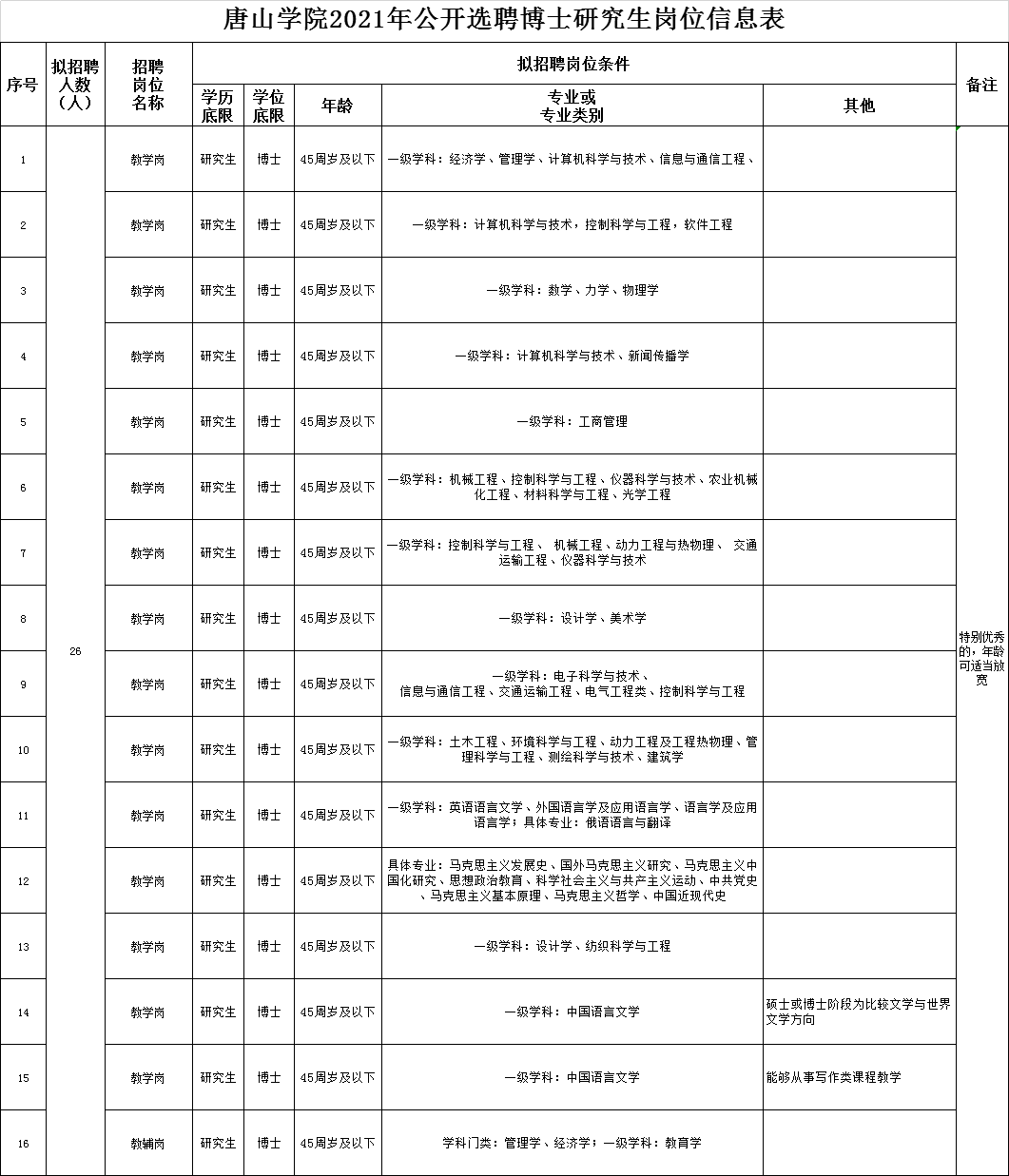 唐山學(xué)院2021年博士研究生招聘公告 根據(jù)《事業(yè)單位人事管理條例》(國務(wù)院第652號令)、《河北省事業(yè)單位公開招聘工作人員暫行辦法》(冀人社發(fā)〔2011〕9號)以及相關(guān)文件精神,經(jīng)上級主管部門批準(zhǔn),擬面向社會公開 ...