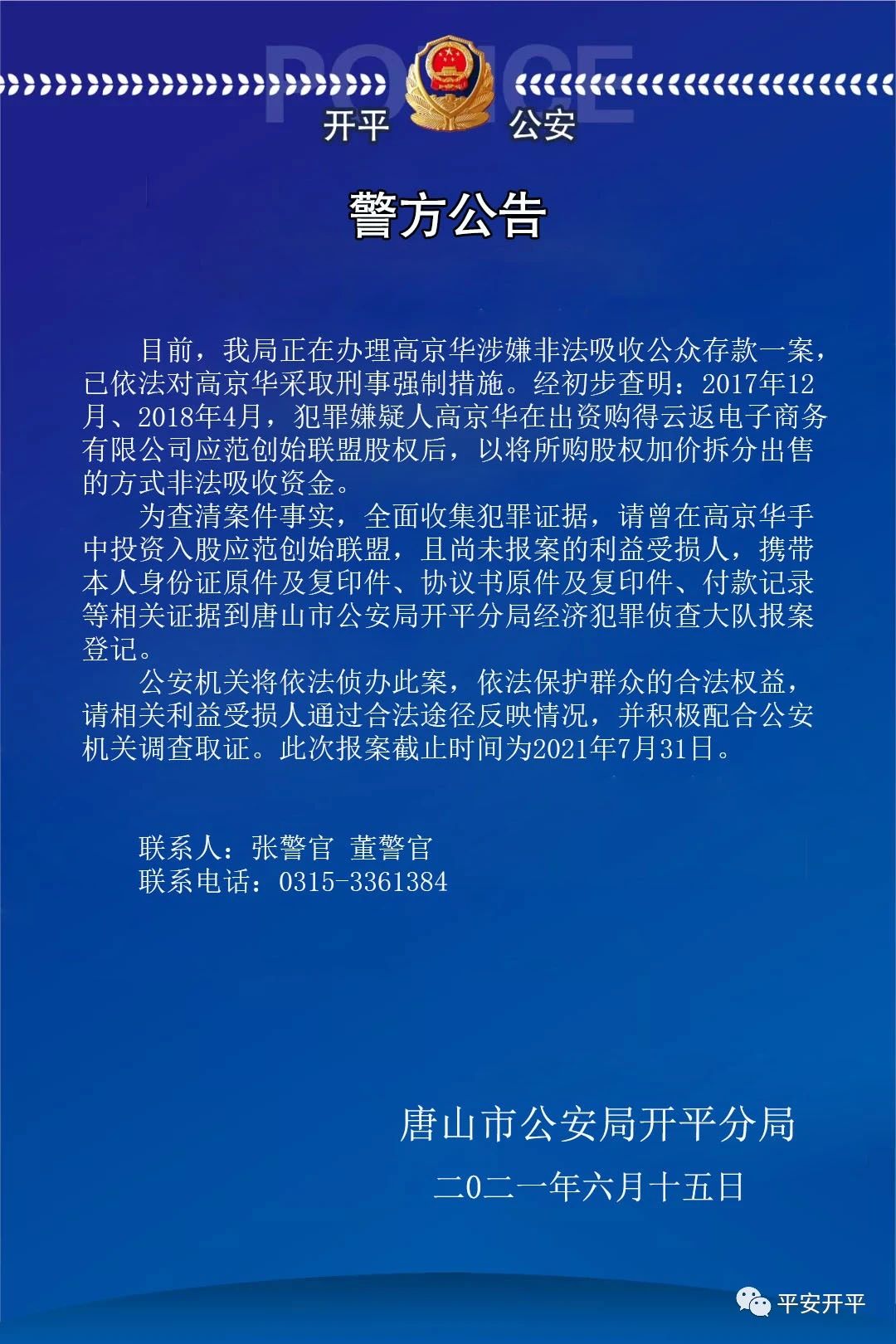 涉嫌非法吸收公眾存款,唐山市公安局開平分局發(fā)布警方公告。 警方公告 目前,我局正在辦理高京華涉嫌非法吸收公眾存款一案,已依法對(duì)高京華采取刑事強(qiáng)制措施 ...