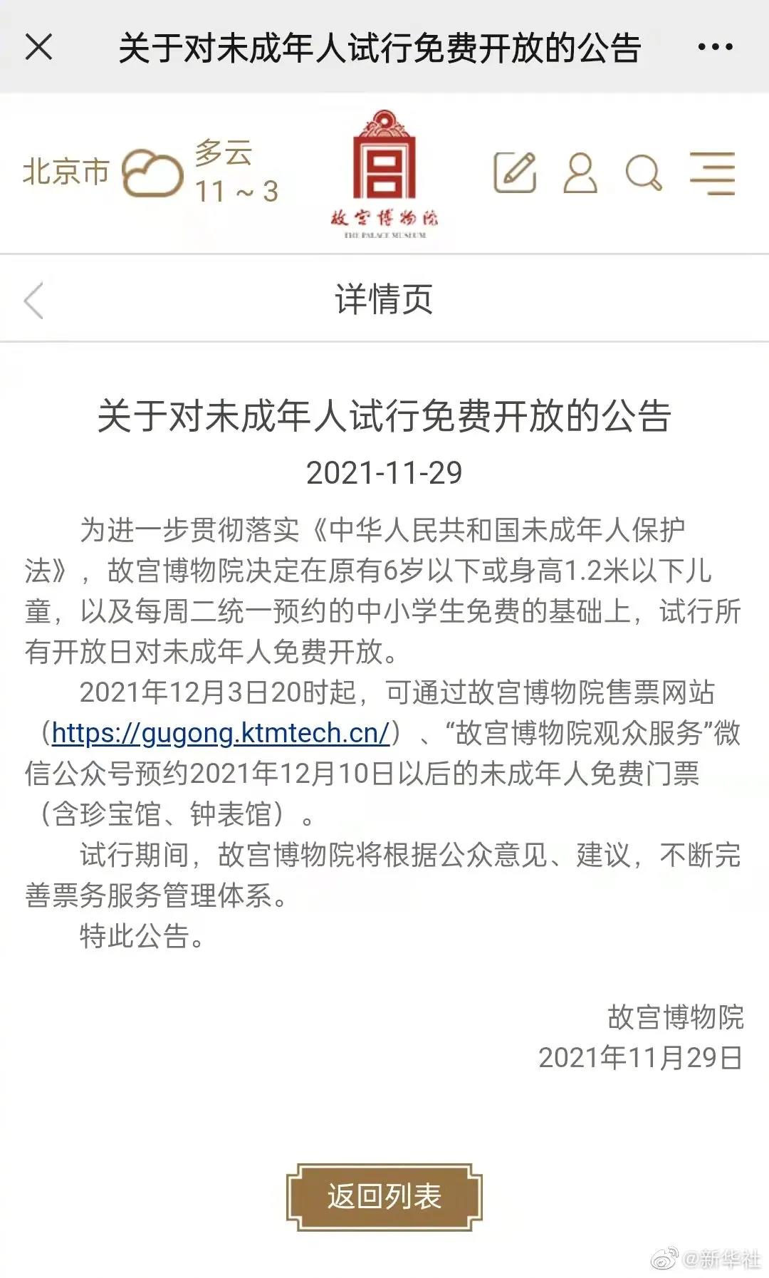 故宮博物院決定在原有6歲以下或身高1.2米以下兒童,以及每周二統(tǒng)一預(yù)約的中小學(xué)生免費(fèi)的基礎(chǔ)上,試行所有開放日對(duì)未成年人免費(fèi)開放。