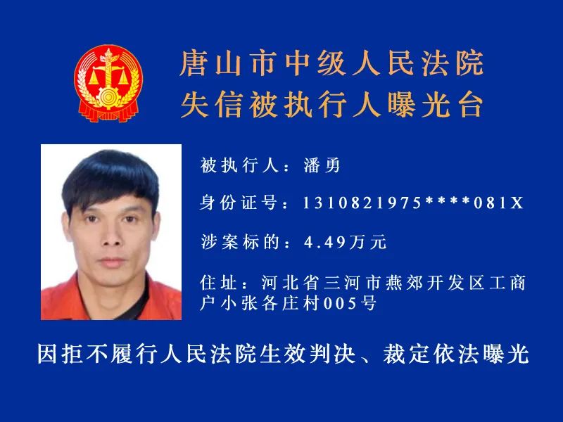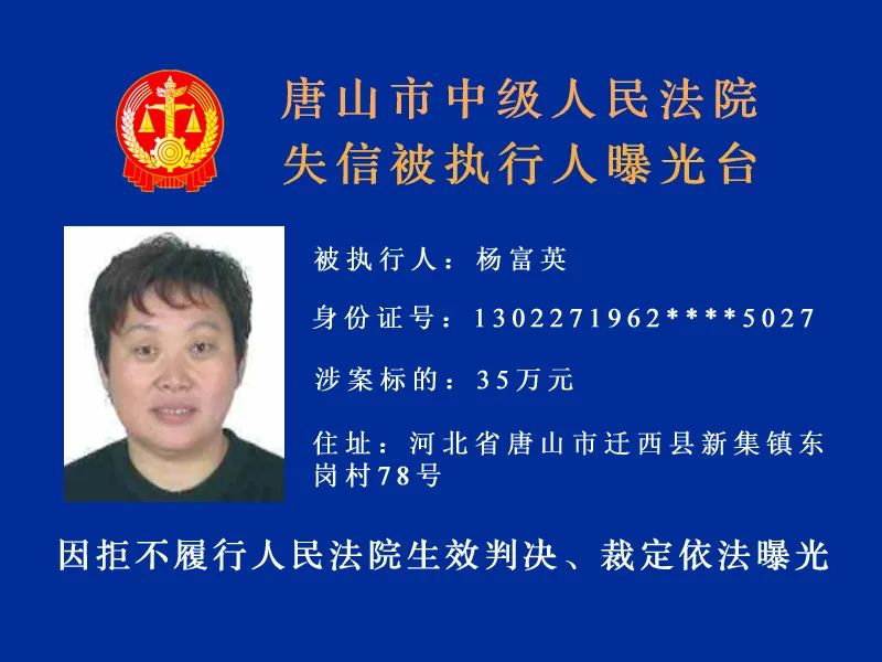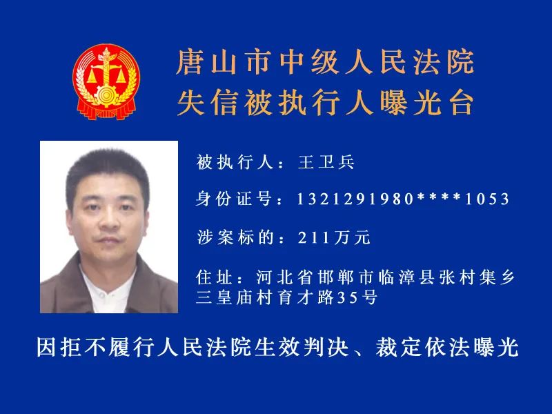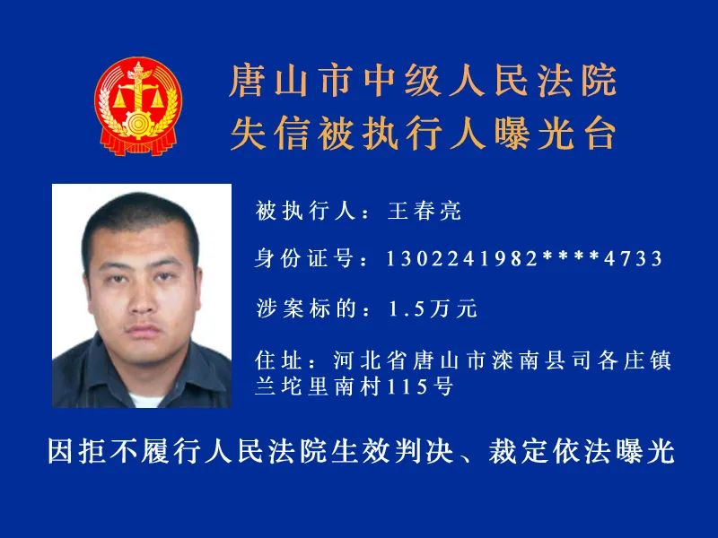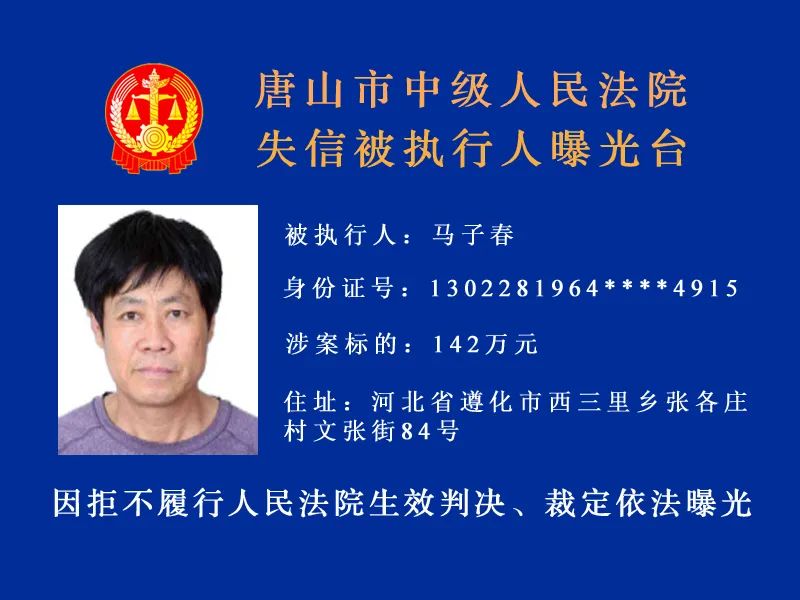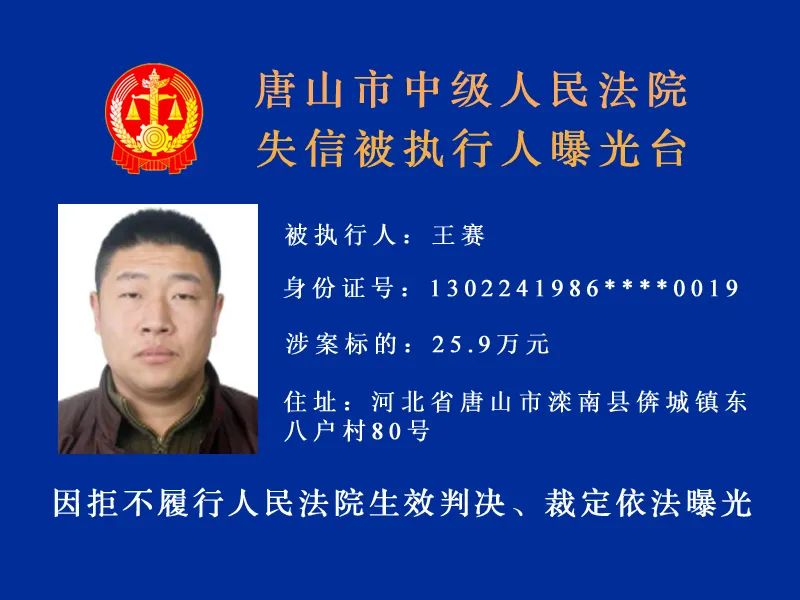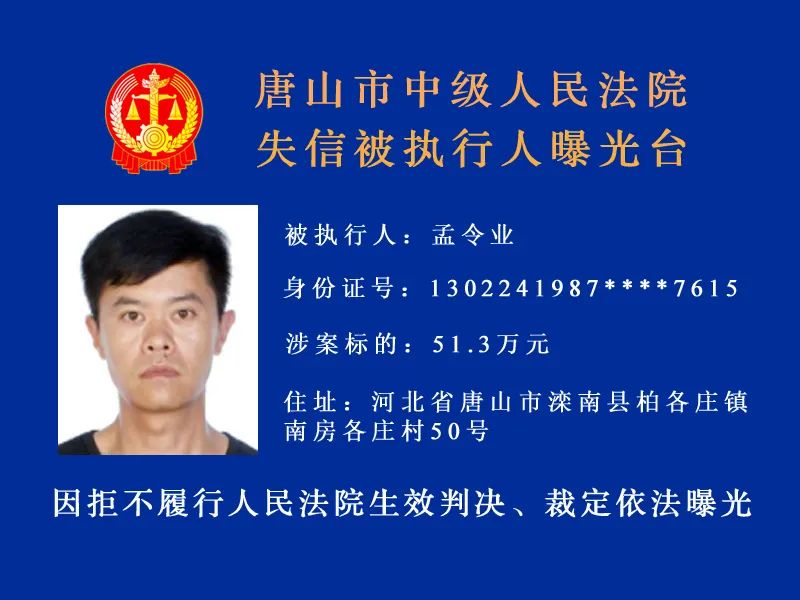 唐山市中級人民法院發(fā)布最新失信被執(zhí)行人名單,詳情: 什么情形會被列入失信被執(zhí)行人名單 被執(zhí)行人未履行生效法律文書確定的義務(wù),并具有下列情形之一的,人民法院應(yīng)當(dāng)將其納入失信被執(zhí)行人名單, ...