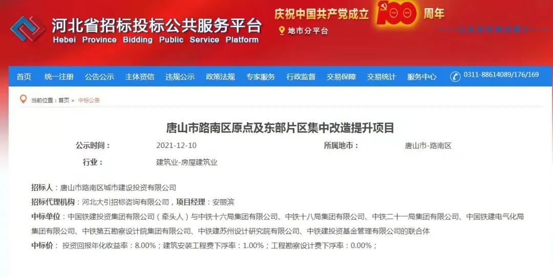 中國鐵建投資集團有限公司等8家央企組成的聯(lián)合體成功中標 路南區(qū)原點及東部片區(qū)集中改造提升項目該項目于11月10日掛網(wǎng)招標12月6日成功開標后經(jīng)過7日到9日為期三天的公示于12月10日公示期滿 據(jù)悉,路南區(qū)原 ...