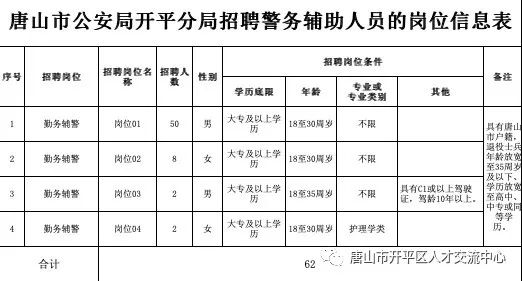 唐山市公安局開平分局公開招聘警務(wù)輔助人員的公告根據(jù)工作需要,唐山市公安局開平分局現(xiàn)面向社會(huì)公開招聘警務(wù)輔助人員62名,按照《唐山市公安機(jī)關(guān)警務(wù)輔助人員管理辦法(試行)》規(guī)定,現(xiàn)將有關(guān)事項(xiàng)公告如下:一、招聘 ...