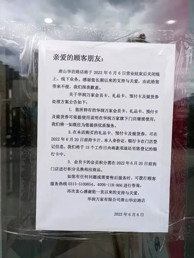 2022年6月6日,唐山華潤萬家(華巖路店)閉店。唐山新華貿(mào)樓下的華潤萬家閉店了,大家相互轉(zhuǎn)告: 親愛的顧客朋友: 唐山華巖路店將于2022年6月6 ...