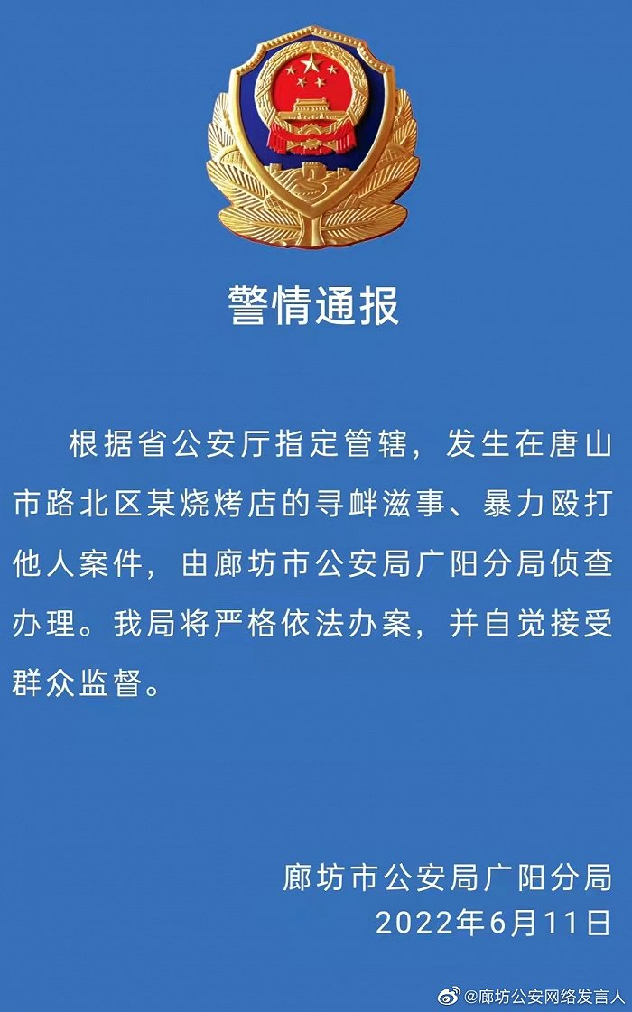 6月11日,河北廊坊市公安局廣陽分局通報稱,根據(jù)河北省公安廳指定管轄,發(fā)生在唐山市路北區(qū)某燒烤店的尋釁滋事、暴力毆打他人案件,由廊坊市公安局廣陽分局偵查辦理。 來源|@廊坊公 ...