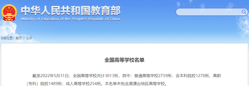 教育部最新發(fā)布全國高等學校名單。截至2022年5月31日,全國高等學校共計3013所,其中:普通高等學校2759所,含本科院校1270所、高職(?疲┰盒1489所;成人高等學校254所。本名單未包 ...