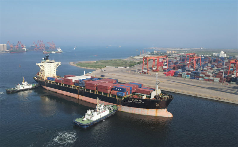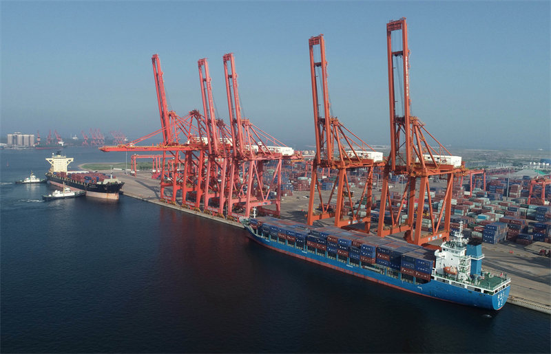 記者從河北省唐山市海洋口岸和港航管理局獲悉,今年1至6月份,唐山港集裝箱吞吐量1395924箱,同比增長12.93%。新華社記者 楊世堯 攝 7月16日,兩艘輪船靠泊在唐山港京唐港區(qū)集裝箱泊位裝貨(無人機(jī)照片)。新華 ...