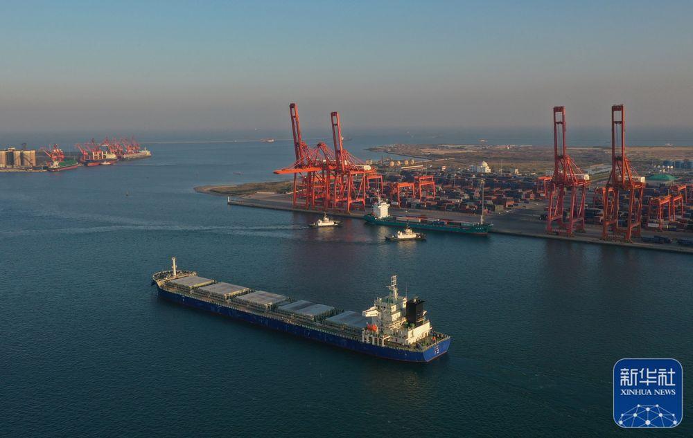 10月11日,一艘輪船靠泊在唐山港京唐港區(qū)集裝箱碼頭卸貨(無人機(jī)照片)。 來源: 新華社客戶端