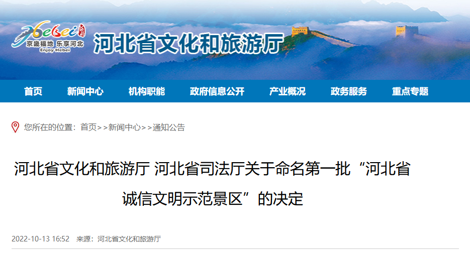 日前,為表彰先進(jìn),省文化和旅游廳、省司法廳決定命名石家莊抱犢寨風(fēng)景區(qū)等15家單位為第一批“河北省誠信文明示范景區(qū)” 河北省文化和旅游廳 河北省司法廳關(guān)于命名第一批“河北省誠 ...