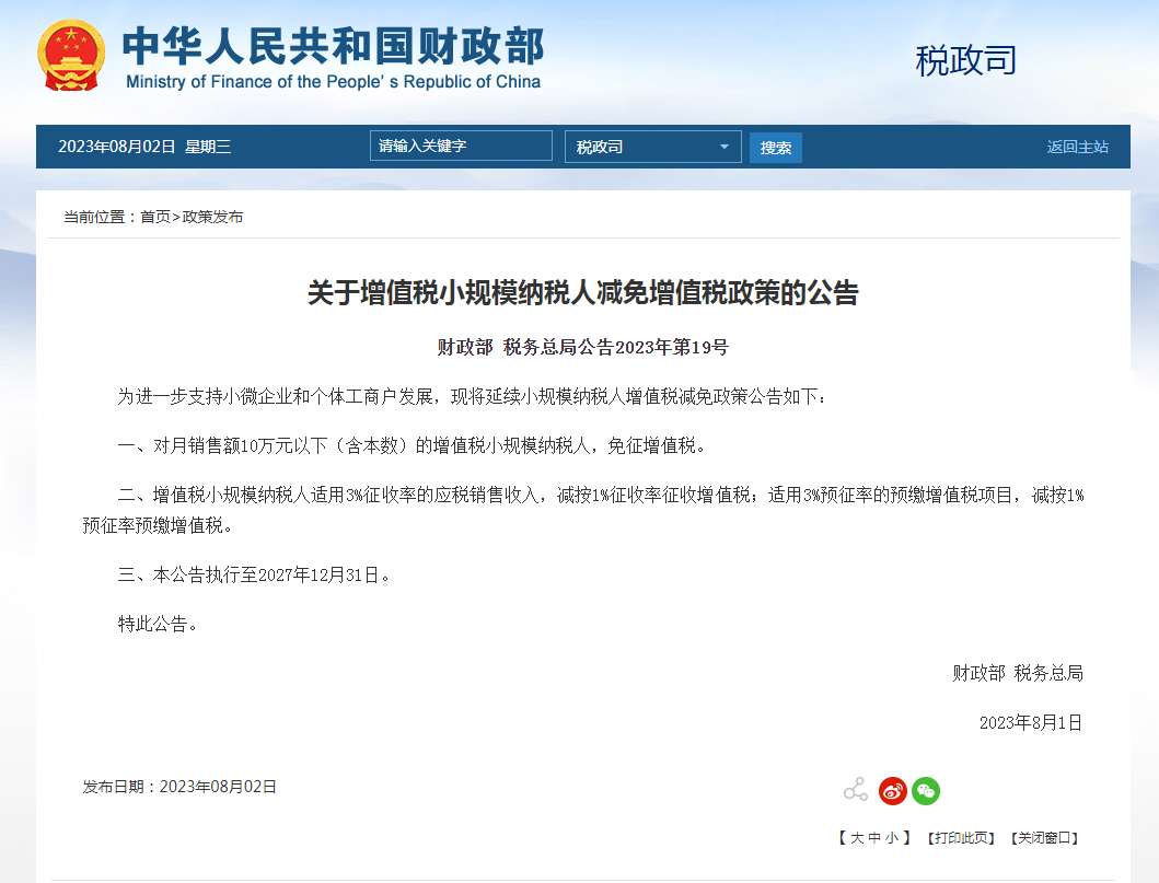 據(jù)財(cái)政部網(wǎng)站8月2日消息,財(cái)政部、稅務(wù)總局發(fā)布《關(guān)于增值稅小規(guī)模納稅人減免增值稅政策的公告》,為進(jìn)一步支持小微企業(yè)和個(gè)體工商戶發(fā)展,將延續(xù)小規(guī)模納稅人增值稅減免政策。 公告如 ...