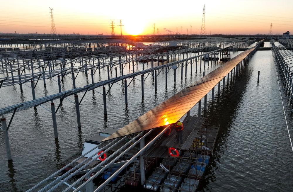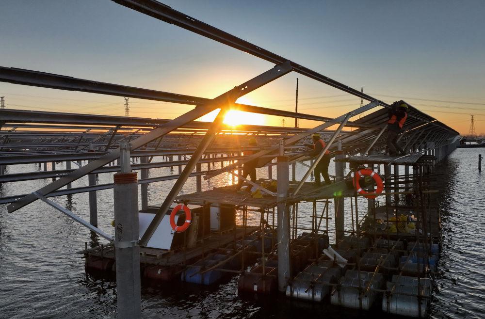 ↑12月1日,工人在河北省唐山市豐南區(qū)黑沿子鎮(zhèn)漁光互補項目建設工地施工(無人機照片)。新華社記者 楊世堯 攝 來源: 新華社