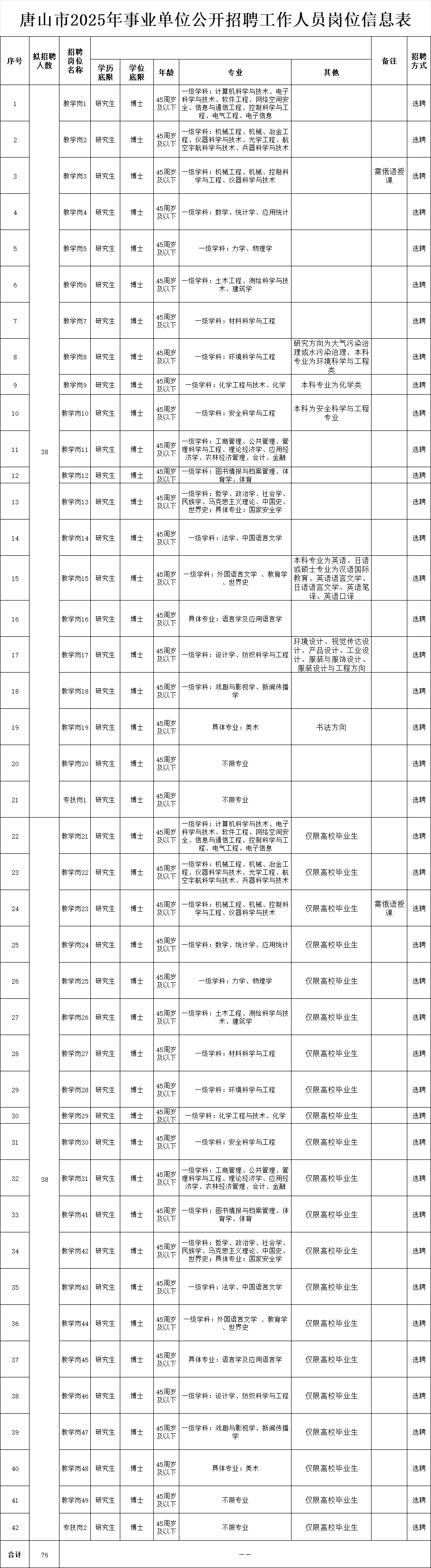 唐山學院2025年面向社會公開選聘博士研究生公告根據(jù)《事業(yè)單位人事管理條例》(國務(wù)院第652號令)、《河北省事業(yè)單位公開招聘工作人員暫行辦法》(冀人社發(fā)〔2011〕9號),唐山學院面向社會公開選聘博士研究生76名, ...