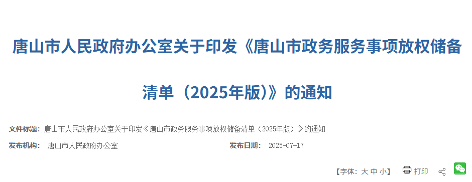 7月17日唐山市人民政府辦公室關(guān)于印發(fā)《唐山市政務(wù)服務(wù)事項放權(quán)儲備清單(2025年版)》的通知