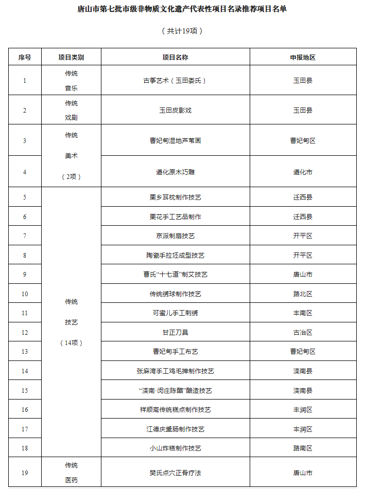 唐山市文化廣電和旅游局 關(guān)于第七批市級非物質(zhì)文化遺產(chǎn)代表性項目名錄推薦項目名單的公示 為進一步健全我市非物質(zhì)文化遺產(chǎn)代表性項目名錄體系,保護弘揚中華優(yōu)秀傳統(tǒng)文化,根據(jù)《中華人 ...