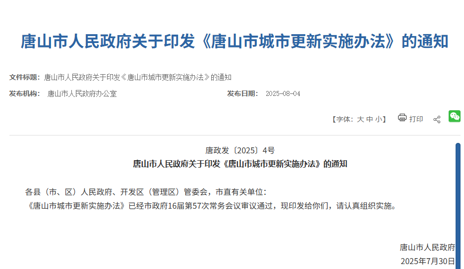 8月4日,唐山市人民政府關(guān)于印發(fā)《唐山市城市更新實(shí)施辦法》的通知,本辦法自2025年7月30日起施行,有效期五年。 第一章 總則 第一條 為規(guī)范城市更新行動(dòng),傳承歷史文脈,提升城市品 ...