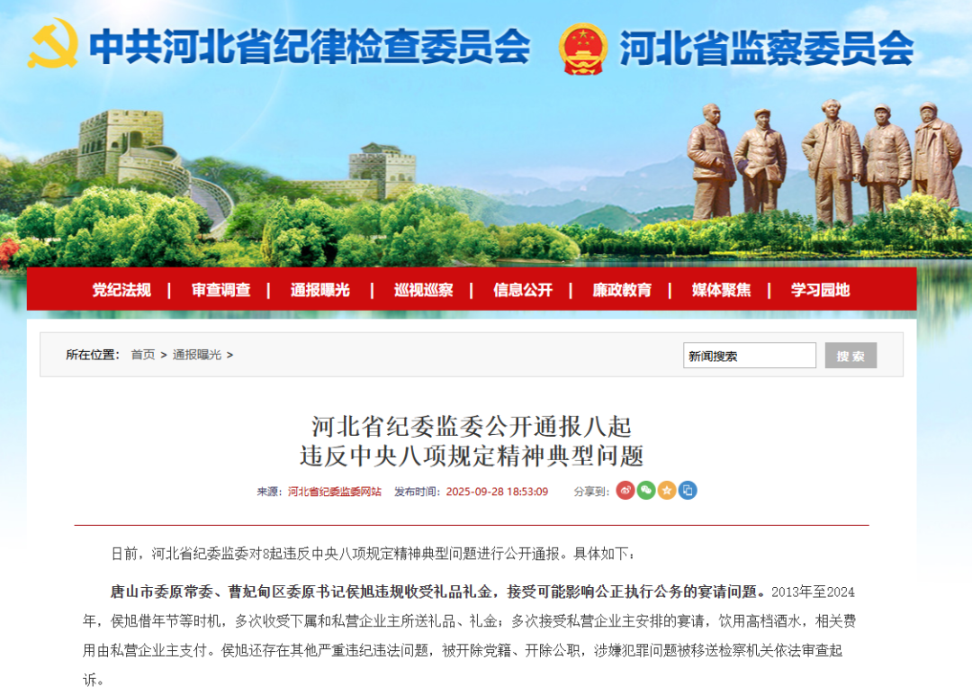 河北紀(jì)委監(jiān)委發(fā)布最新通報(bào)! 唐山市委原常委、曹妃甸區(qū)委原書記侯旭 嚴(yán)重違紀(jì)違法被開(kāi)除黨籍和公職 日前,河北省紀(jì)委監(jiān)委對(duì)8起違反中央八項(xiàng)規(guī)定精神典型問(wèn)題進(jìn)行公開(kāi)通報(bào)。具體如下: &nb ...
