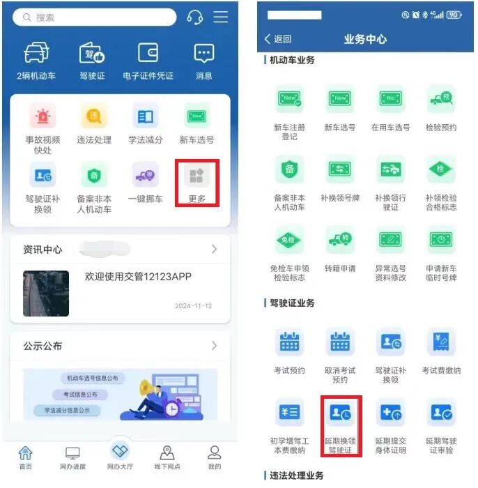 延期換領(lǐng)駕駛證步驟一:登錄“交管12123”APP,點(diǎn)擊更多進(jìn)入【業(yè)務(wù)中心】,選擇【延期換領(lǐng)駕駛證】。