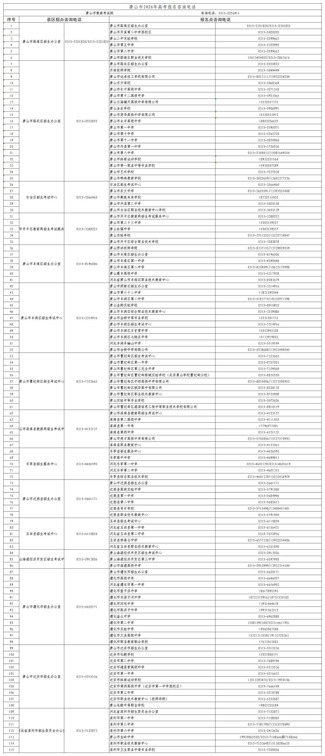 2026年河北省普通高校招生考試報名工作于10月28日開始。為方便考生,現(xiàn)將唐山市各縣區(qū)招生辦、各報名點(diǎn)咨詢電話公布。若在報名過程中有問題,可于工作時間向報名所在地招生辦及報名點(diǎn)咨 ...