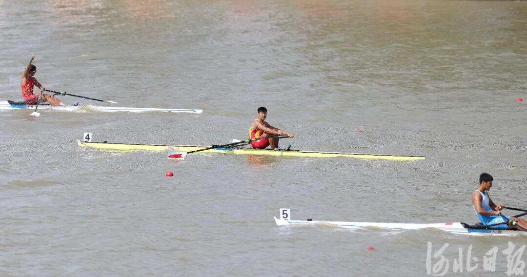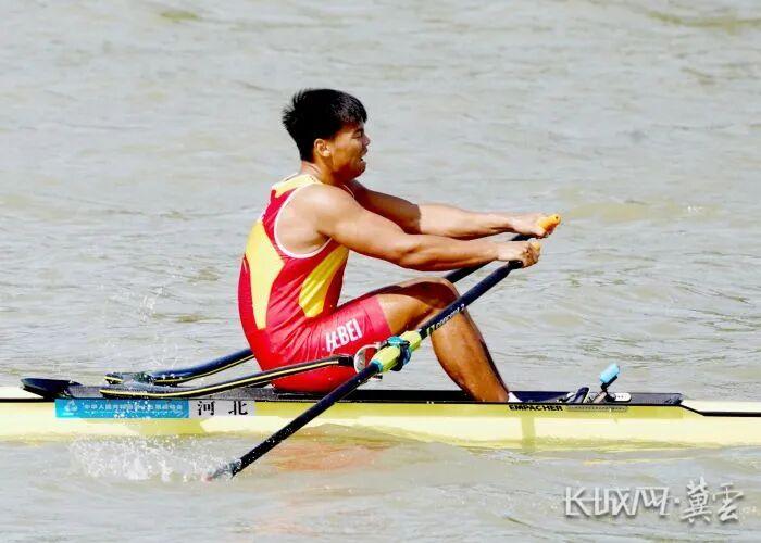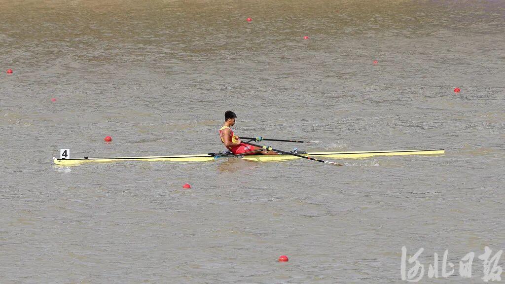 圖為韓崴(中)在比賽中。河北日?qǐng)?bào)記者 耿輝 攝今年25歲的韓崴來自唐山,曾奪得杭州亞運(yùn)會(huì)男子四人雙槳和全國(guó)錦標(biāo)賽男子單人雙槳冠軍。